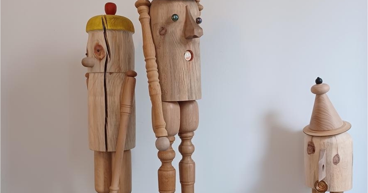 Naast zijn dagelijkse activiteit als ambachtelijk meubelmaker, bouwt hij als een moderne Gepetto met de resten van zijn tafels aan een fascinerend universum van handmatig gedraaide, massieve houten beelden.
